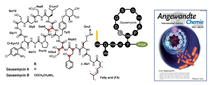 Установлена структура первых представителей семейства нового класса природных антибиотиков, гауземицинов А и В, продуцируемых Streptomyces sp. штамма INA-Ac-5812. Антибиотики относятся к липогликопептидам, имеют циклический скелет и содержат редкие структурные элементы, особенно α-L-арабинопиранозный остаток, петидный кор и др. Показана выраженная Ca2+-зависимая активность гауземицинов А и В в отношении грамположительных бактерий, что создало перспективу для получения эффективных противобактериальных средств на основе полученных соединений после оптимизации их структур и профиля фармакологических характеристик.