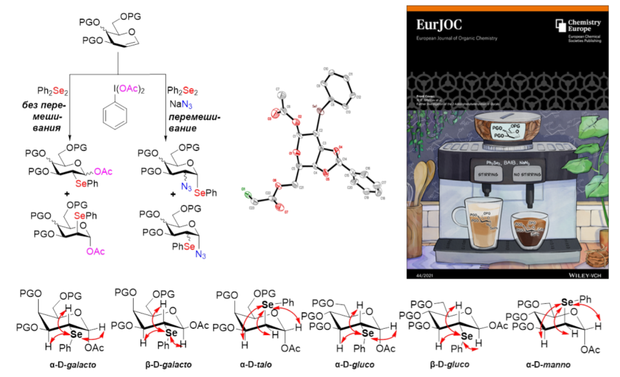 Разработаны препаративные условия для одностадийного 2-азидофенилселенилирования и 2-фенилселеноацетилирования гликалей. В первом случае реакция проводится при взаимодействии гликалей с Ph2Se2, PhI(OAc)2 и NaN3 при интенсивном перемешивании. Так, из 3,4,6-три-O-ацетил-D-галакталя с высоким выходом 58% образуется кристаллический фенил-3,4,6-три-O-ацетил-2-азидо-2-дезокси-1-селено-α-D-галактопиранозид — малодоступный другими методами, но очень эффективный блок для сборки сложных олигосахаридов. Найдено, что при проведении реакции без перемешивания образуются соответствующие 1-O-ацетил-2-селено-2-дезоксипроизводные — продукты ацетоксифенилселенилирования гликалей под действием PhI(OAc)2 и Ph2Se2. Указанные продукты являются удобными промежуточными соединениями для получения 2-дезоксисахаров. Проведено детальное исследование синтезированных 2-селено-2-дезоксигликозидов методами спектроскопии 1Н, 13С и 77Se ЯМР, в том числе впервые определены закономерности величин химических сдвигов и КССВ nJSe-H, в зависимости от стереохимической конфигурации моносахаридного кольца и аномерного центра.