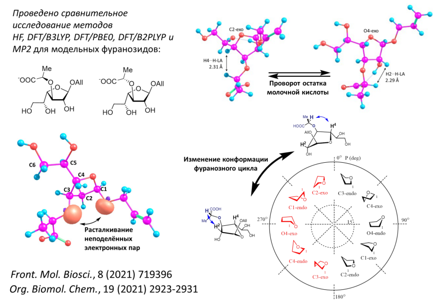 Для выяснения особенностей 3D-строения фуранозил-содержащих олигосахаридов, влияющих на их иммунологические свойства, проведены теоретические исследования конформационной подвижности галактофуранозильных остатков как в виде моносахаридов, так и в составе олигосахаридов. В работе сопоставлялись квантово-химические методы для анализа конформационного состояния, которые включали классический метод Хартри-Фока, метод функционала плотности (DFT) с различными функционалами (B3LYP, PBE0, а так же двойной гибридный функционал B2PLYP) и приближение RI-MP2. В случае функционала B3LYP использовалась так же дисперсионная коррекция Гримме D3. Кроме незамещённых фуранозидных производных исследованы и структуры, имеющие в своем составе остаток молочной кислоты при О-3. Найдено, что для адекватного описания конформационного равновесия необходимо использование как минимум метода DFT с дисперсионной поправкой. Методы RI-MP2 и B2PLYP так же демонстрировали удовлетворительные результаты, но при этом они являются существенно более требовательными к вычислительным ресурсам. Было показано, что в моносахаридах, модифицированных молочной кислотой, вращение данного остатка может вызывать конформационные переходы в фуранозидном кольце, чего обычно не наблюдается в пиранозидных структурах. Анализ оптимизированных структур методом Natural Bond Orbitals (NBO) позволил предположить, что этот эффект может быть связан с так называемым 1,3-син-диаксиальным расталкиванием неподеленных электронных пар на атомах кислорода О-3 и О-1. Так же был проведен квантово-механический расчет ЯМР констант экранирования 1Н фуранозидных колец. Выяснилось, что, в отличие от пиранозидов, константы экранирования в фуранозидах слабо меняются в зависимости от конформации пиранозного цикла.