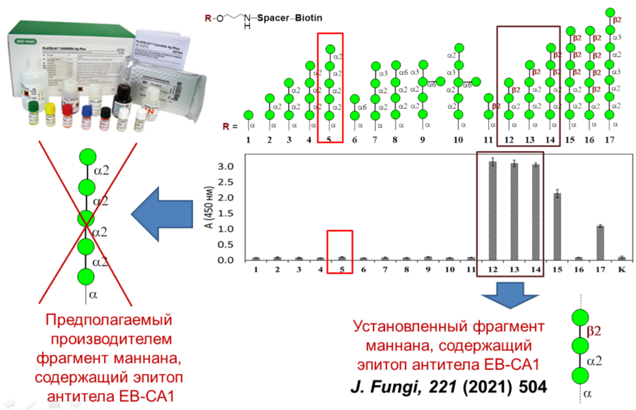 Используя панель иммобилизованных на поверхности иммунологического планшета манноолигосахаридов (Glycoarray), структурно родственных фрагментам полисахарида маннана грибкового патогена Candida albicans, установлена эпитопная специфичность моноклонального антитела EB-CA1, которое используется в иммуноферментном диагностикуме Platelia Candida Antigen Plus (Bio-Rad, Франция). Указанный диагностикум предназначен для обнаружения в образцах сыворотки крови маннана как маркера инвазивного кандидоза, являющегося особо опасным грибковым заболеванием с высоким уровнем летальности. Поражение Candida, например для госпитализированных с инфекцией COVID-19, может кратно увеличивать вероятность смертельного исхода. Именно поэтому необходимость контроля маннанового маркера внесена в рекомендации по лечению и диагностике инфекции COVID-19. Проведённое исследование показало, что производителем набора Platelia Candida Antigen Plus неправильно установлена специфичность антитела EB-CA1, которое распознаёт трисахаридный эпитоп b-Man-(1®2)-a-Man-(1®2)-a-Man, а не гомо- a-(1®2)-связанный пентасахарид, как сообщается производителем. Это может снижать чувствительность и специфичность диагностикума на основе антитела EBCA-1. Полученные данные выявили пути для создания более эффективного антитела для обнаружения маркерного маннана.