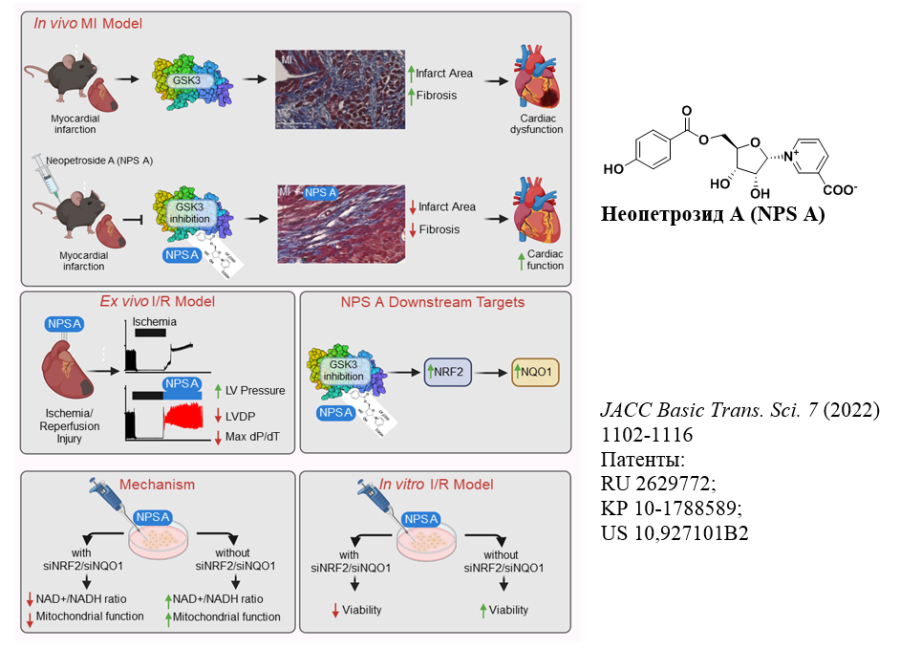 - Неопетрозид А (NPS A) стабилизировал сердечную гемодинамику и дыхательную способность митохондрий ex vivo после ишемического/реперфузионного повреждения сердца крыс.