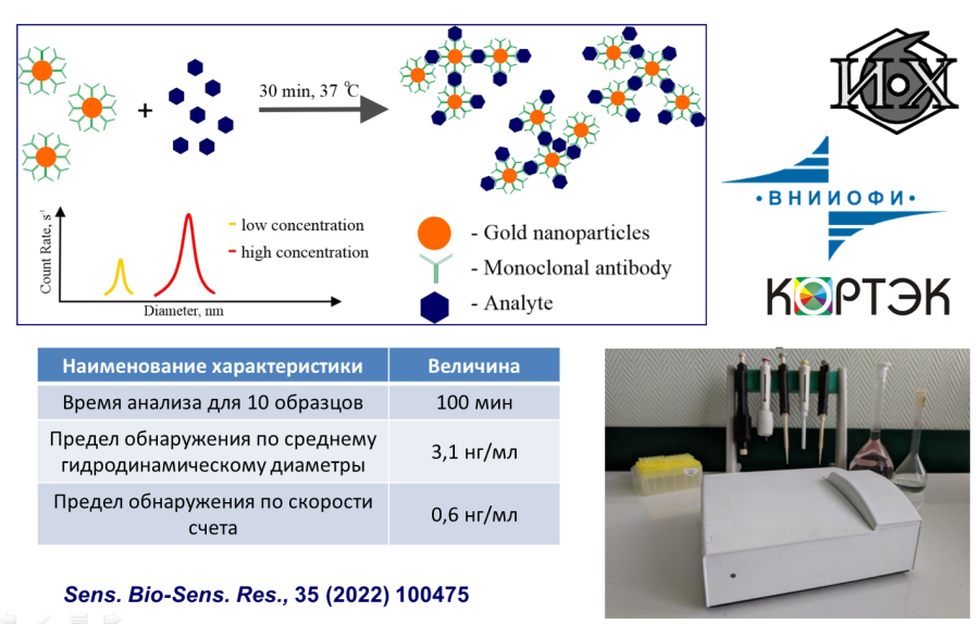Разработан оптический наносенсор для высокочувствительного и специфичного обнаружения галактоманнана — диагностического маркера опасного заболевания инвазивного аспергиллёза, вызываемого грибковым патогеном Aspergillus fumigatus. Метод позволяет обнаруживать галактоманнан в клинических изолятах при концентрациях менее 1 нг/мл, в том числе при автоматизированном проведении анализа. Основными компонентами диагностической тест-системы сэндвичевого типа являются синтетический олигосахарид, отражающий иммунодетерминантный фрагмент галактоманнана, моноклональное антитело, распознающее галактоманнан и полученное с использованием синтетического олигосахарида, а также наночастицы золота. Работа выполнена в сотрудничестве с ФГУП «Всероссийский научно-исследовательский институт оптико-физических измерений» (ФА Росстандарт), ООО ХЕМА и ГК «КОРТЭК».
