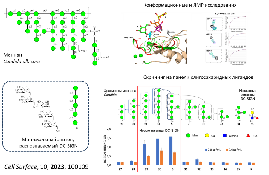 Рецептор DC-SIGN, экспонированный на дендритных и некоторых других иммунных клетках, играет важную роль в формировании защитной реакции иммунной системы человека. Долгое время имелась противоречивая информация о структуре углеводных лигандов данного рецептора, экспонированных на поверхности клеток патогенов, распознавание которых индуцирует формирование защитной реакции иммунной системы. В частности, сообщалось, что такими лигандами являются производные олигосахаридов 34 и 35 (см. рисунок ниже), а также, что наиболее активный лиганд входит в состав гетерогенного разветвленного полисахарида маннана, экспонированного на клеточной мембране Candida albicans и ряда других микопатогенов. С использованием панели специально синтезированных олигосахаридов, родственных основным типам грибковых полисахаридов, была выявлена группа высокоспецифичных лигандов DC-SIGN, включающих пентаманнозидный фрагмент, состоящий из последовательности маннозных звеньев, соединенных между собой α-(1→2)- и α (1→3)-связями. Проведенные конформационный анализ, теоретический экспериментальный докинг (ЯМР-STD) позволили установить топологию углевод-белкового распознавания и выявить структуру высокоафинного эпитопа, вовлечённого во взаимодействие с DC-SIGN. Он не является общим для всех видов грибов, что может объяснять видоспецифический характер распознавания патогенов через рецептор DC-SIGN. Найденные высокоаффинные лиганды DC-SIGN являются не только инструментами для исследований механизмов грибкового врожденного иммунитета и антикандидозной защиты, но и создали основу для дизайна иммуномодуляторов и компонентов вакцин, которые уже ведутся авторами работы. Работа выполнена в сотрудничестве с Университетами Бильбао (Испания) и Экстера (Великобритания).