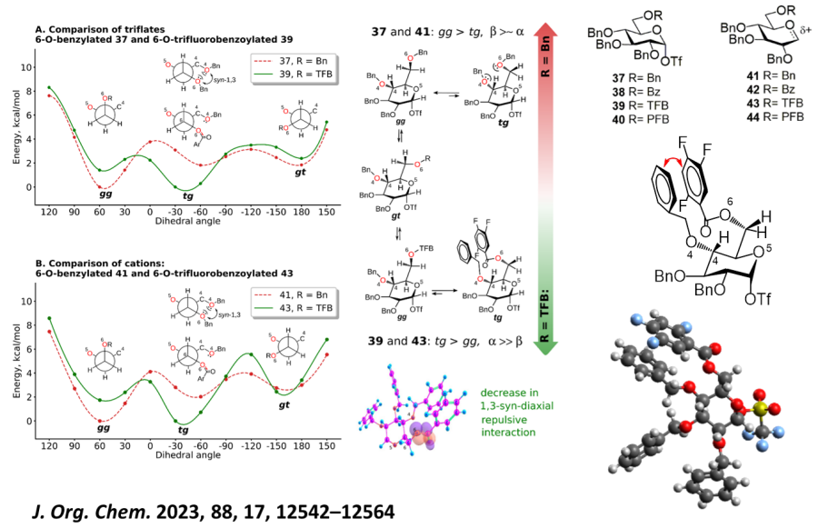 Методами квантовой механики проведено изучение серии предполагаемых интермедиатов, образующихся в реакции глюкозилирования с участием глюкозил-трифлатов и соответствующих им оксокарбениевых ионов (см. рис.). В качестве модельных соединений использованы сполна бензилированные моносахариды, различающиеся заместителями при О-6. Методом функционала плотности проведено сканирование торсионного угла, описывающего вращение вокруг связи С5-С6 в исследованных структурах. Найдено, что замена заместителя при О-6 с бензильного на бензоильный приводит к заметному изменению конформационного поведения данной связи: вместо гош-гош конформера, характерного для обычных производных глюкозы, становится заметен вклад транс-гош конформера, а в случае электроотрицательных фторсодержащих бензоильных заместителей данный конформер становится преобладающим. Обнаруженный эффект был объяснён исходя из предположения, что наличие при О-6 бензоильного заместителя, особенно электроотрицательного, приводит к ослаблению 1,3-син-диаксиального расталкивания неподеленных пар на атомах кислорода О-6 и О-4. Данный вывод был подтвержден результатами квантово-химических расчетов методом NBO. Дополнительным вероятным объяснением наблюдаемого конформационного эффекта, вызываемого заместителем при О-6, может являться и π-π взаимодействие фенильных колец в транс-гош конформерах (показано красной стрелкой), возможность которого подтверждена расчетами. Полученные результаты могут быть объяснением наблюдаемого экспериментально изменения α/β-селктивности в реакциях глюкозилирования. Найденные закономерности влияния заместителя при О-6 были успешно использованы нами для стереоспецифичного синтеза серии α-(1→3)-связанных олигоглюкозидов, структурно родственных фрагментам α-(1→3)-D-глюкана патогенного грибка Aspergillus fumigatus.