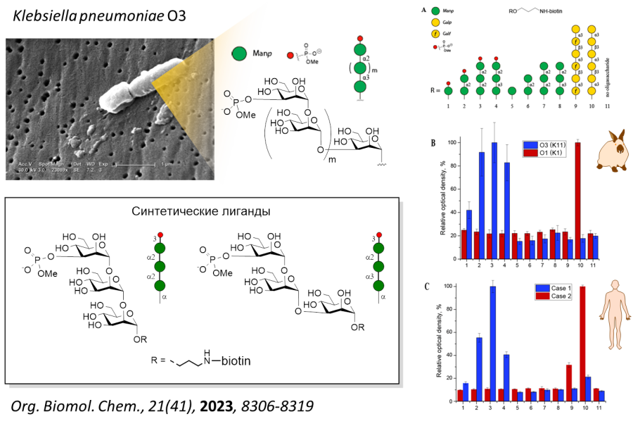 Впервые проведен стереонаправленный синтез олигосахаридов, отвечающих терминальным фрагментам O-цепи липополисахарида (ЛПС) патогенной бактерии Klebsiella pneumoniae серотипа O3, а также их биотинилированных конъюгатов. В сотрудничестве с коллегами из НИИ вакцин и сывороток им. И.И. Мечникова (Москва), ФГБУ «НМИЦ онкологии» Минздрава России (Ростов-на-Дону), ФГБУ ДНКЦИБ ФМБА (С.-Петербург) с использованием специально разработанного метода для анализа антигенных свойств олигосахаридов, установлены иммунодетерминантные фрагменты О3-антигена, что создало основу для последующей разработки вакцины против госпитальных инфекций, вызываемых антибиотикорезистентными штаммами Klebsiella pneumoniae О3, — опаснейшего заболевания, характеризующегося тяжелым течением и высокой летальностью.