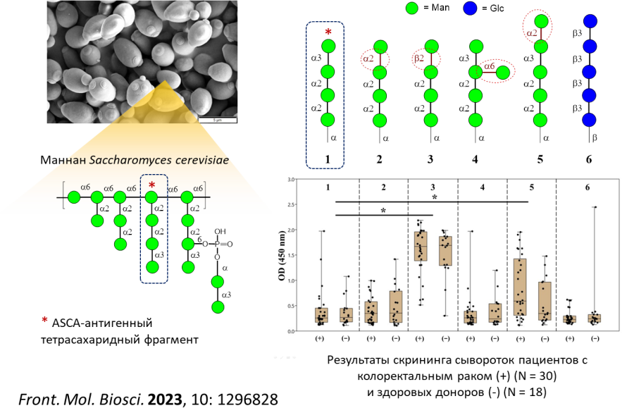 Впервые проведено систематическое исследование уровня антител к олигосахаридам, родственным известному маркеру воспалительных заболеваний кишечника (ASCA-антигену), в сыворотках крови пациентов с колоректальным раком и здоровых доноров. С использованием специально разработанных методик формирования углеводного дисплея определены структурные модификации в цепях α‑маннана, существенно изменяющие их антигенные свойства, а также выявлены перспективные олигосахаридные лиганды, демонстрирующие различные результаты для двух исследованных групп. Полученные результаты открывают новые возможности для совершенствования существующих тест-систем ИФА, а также для разработки диагностических наборов на основе фрагментов грибковых маннанов с новыми свойствами. В сотрудничестве с ФГБУ «НМИЦ онкологии» им. Н. Н. Блохина Минздрава России (Москва).