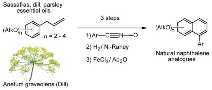 ✓ Analogues of the bioactive natural alkoxynaphthalene pycnanthulignene D were synthesized by an efficient method. The starting plant allylalkoxybenzenes are easily available from the plant essential oils of sassafras, dill and parsley. The target 1-arylalkoxynaphthalenes exhibited antiproliferative activity in a phenotypic sea urchin embryo assay.