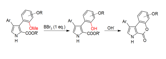 ✓ A metal-free approach to 3,4-diarylpyrrole-2-carboxylate and pyrrolocoumarin cores of lamellarins and related natural products based on Barton–Zard reaction of nitrostilbenes with ethyl isocyanoacetate was developed. In the case of diarylpyrrole-2-carboxylates with a 3-(o-methoxyphenyl) fragment, treatment with 1 equiv. of BBr3 resulted in selective O-demethylation of the ortho-methoxy group, while other methoxy groups in the molecule remained intact. The resulting 3-(2-hydroxyphenyl)pyrrole-2-carboxylates underwent baseinduced lactonization to form the target pyrrolocoumarins