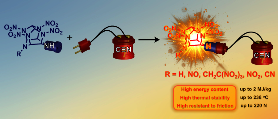 ✓ Для создания энергетических веществ нового уровня необходимо расширять арсенал методов функционализации энергоёмких структур, с помощью которых можно настраивать их физико-химические и энергетические характеристики на молекулярном уровне. С этой целью мы разработали подход к синтезу новой серии энергетических каркасных соединений с улучшенными свойствами путём введения N-цианогруппы в полинитрогексаазаизовюрцитановый каркас. Структуры полученных соединений были полностью охарактеризованы комплексом физико-химических методов, включая мультиядерную (1H, 13C{ 1H}, 14N, 15N{ 1H}) ЯМР и ИК-спектроскопию, масс-спектрометрию высокого разрешения, рентгеноструктурный анализ, электронную микроскопию и квантово-химические расчеты. Для полученных веществ проведены испытания на термическую стабильность и безопасность, проведены калориметрические и пикнометрические измерения, а также определен энергетический потенциал путем высокотемпературных термодинамических расчётов химического равновесия. Новые цианопроизводные имеют приемлемую плотность (до 1.92 г/см3) и высокую энтальпию образования (до 2 МДж/кг), что в 2 раза выше, чем у эталонного CL-20. Устойчивость целевых соединений к трению (до 220 Н) является наиболее высокой по сравнению с CL-20 и его известными аналогами. 4,10-Дициано-2,6,8,12-тетранитро-2,4,6,8,10,12-гексаазаизовюрцитан нового ряда является наиболее термически стабильным (Tразл 238 °С) среди известных энергоёмких полинитрогексаазаизовюрцитанов и является первым производным этого семейства, превосходящим CL-20 по термостойкости.