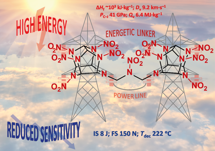 ✓ Для решения актуальных задач по реализации современной космической программы необходим поиск новых высокоэнергетических компонентов ракетного топлива. С этой целью мы создали новое семейство высокоэнергетических материалов — полинитрогексаазаизовюрцитаны, связанные N,N'-метиленовым мостиком, содержащие вторичные амино-, N-нитро-, N-нитрозо-, N-(2,2,2-тринитроэтильные)-, N-азидометильные- концевые группы, а также разработали эффективный подход к их синтезу путём конденсации соответствующих N-метоксиметильных предшественников и целевой функционализации энергоёмкими группами. Все полученные соединения были полностью охарактеризованы с помощью масс-спектрометрии высокого разрешения, ИК- и мультиядерной ЯМР-спектроскопии (1H, 13C{ 1H}, 14N, 15N), а также методом рентгеноструктурного анализа. Для этих веществ энтальпии образования определены экспериментально методом калориметрии сжигания. Были проведены исследования термической стабильности и испытания на безопасность. Их энергетический потенциал в качестве компонентов ракетного топлива был изучен с использованием термодинамических расчётов высокотемпературных химических равновесий. Соединения новой серии обладают высокой плотностью (до 1.95 г см–3) и термостойкостью (начало разложения до 226 °С). Кроме того, они имеют очень высокую энтальпию образования (до ~2 МДж кг–1, что в 2 раза больше, чем у CL-20), и пониженную чувствительность к трению (на 100 Н ниже, чем чувствительность к трению CL-20). Замечательные комплексные характеристики делают эти материалы перспективными для использования в энергетических композициях.