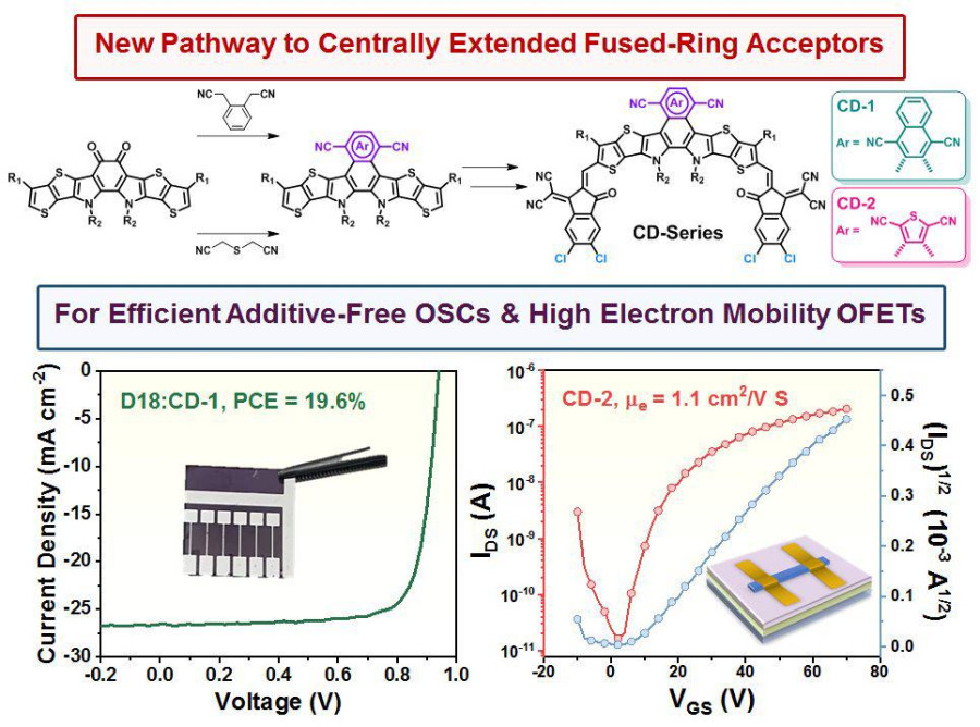 ✓ Сотрудниками ИОХ РАН совместно с китайскими партнёрами из Нанкайского университета посредством стратегии циклоароматизации по реакции Хинсберга был разработан новый синтетический подход к построению полиароматических конденсированных структур как компонентов нефуллереновых акцепторов для органических солнечных элементов. Полученные нефуллереновые акцепторы CD-1 и CD-2 демонстрируют компактную трехмерную взаимопроникающую сетчатую структуру с высоким коэффициентом упаковки в монокристалле и, следовательно, высокую способность к переносу электронов, о чем свидетельствует высокая подвижность электронов более 1.1 см2 V-1 s-1 в органических полевых транзисторах на основе CD-2. Примечательно, что бинарные органические солнечные ячейки без добавок на основе CD-1 и CD-2 продемонстрировали близкую к рекордным фотовольтаическую эффективность (КПД) 19.6% и 19.1%, соответственно, с хорошо сбалансированным напряжением холостого хода и плотностью тока короткого замыкания. Эти результаты подчеркивают потенциал новой стратегии молекулярного дизайна для разработки высокопроизводительных нефуллереновых акцепторов.