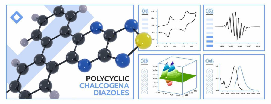 ✓ Сотрудниками ИОХ РАН совместно с коллегами из НИОХ РАН им Н.Н. Ворожцова и ФИАН РАН им. П.Н. Лебедева методами термогравиметрии/ дифференциальной сканирующей калориметрии, спектроэлектрохимии и оптической спектроскопии, циклической вольтамперометрии и электронного парамагнитного резонанса изучены нейтральные и ион-радикальные состояния конденсированных фенантро- и дибензохиноксалино-1,2,5-сера(селен)диазолов. Показано, что по сравнению с архетипическим 2,1,3-бензотиадиазолом, π-расширение и замена S на Se совместно приводят к увеличению адиабатического сродства к электрону, уменьшению абсолютных значений CV-потенциалов, уширению и батохромным сдвигам полос УФ-спектров. Полученные данные свидетельствуют о том, что изученные структуры являются перспективными органическими красителями/нефуллереновыми акцепторами электронов для молекулярной оптоэлектроники.
