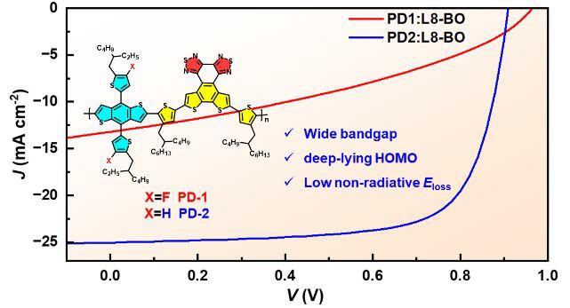 ✓ Сотрудниками ИОХ РАН разработан эффективный метод синтеза новой электронодефицитной гетероциклической системы, дитиенобензо-бис-тиадиазола, на основе которого совместно с китайскими партнёрами из Нанкайского университета синтезированы полимерные доноры – важнейшие компоненты активного слоя органических солнечных элементов. Показано, что полимеры не только обладают широкой оптической запрещенной зоной, превышающей 2.0 эВ, но и демонстрируют глубоко расположенные уровни энергии наивысшей занятой молекулярной орбитали. На основе синтезированных донорных полимеров и коммерчески доступного нефуллеренового акцептора L8-BO-X сконструированы бинарные солнечные ячейки, одна из которых показала высокое значение фотовольтаической эффективности 16.34%, что говорит о перспективности этого семейства полимерных доноров.