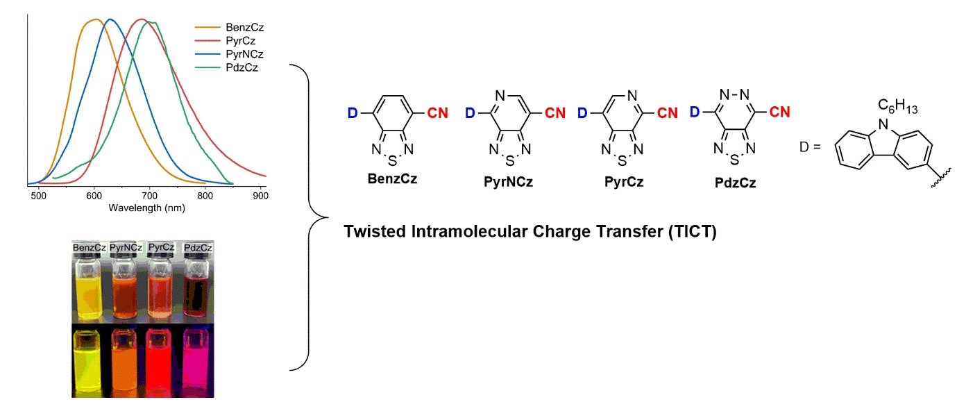✓ Сотрудниками ИОХ РАН совместно с коллегами из ФИАН им. П.Н. Лебедева синтезированы несимметричные флуоресцентные соединения типа D–A–А на основе конденсированных 1,2,5-тиадиазолов с акцепторной цианогруппой, которые продемонстрировали флуоресценцию из скрученного состояния с внутримолекулярным переносом заряда (TICT) —фотохимический процесс, при котором электрон переносится с электронодонорной группы на электроноакцепторную, после чего происходит скручивание молекулярной структуры. Для получения этих молекул нами были найдены условия проведения нескольких последовательных реакций замещения двух атомов брома исходной молекулы цианированием и кросс-сочетанием по Сузуки-Мияуре. Полученные результаты показали, что введение в молекулу конденсированного 1,2,5-тиадиазола цианогруппы и карбазольного донорного фрагмента приводит в зависимости от положения атома азота во внутреннем акцепторном блоке к планаризации структуры в возбужденном состоянии из-за образования водородной связи N-H между азотом и водородом донорного блока, в результате чего спектр люминесценции претерпевает сильный батохромный сдвиг. Это открывает новые возможности для разработки высоколюминесцентных органических красителей для применения во флуоресцентных зондах, сенсорах и солнечных батареях.