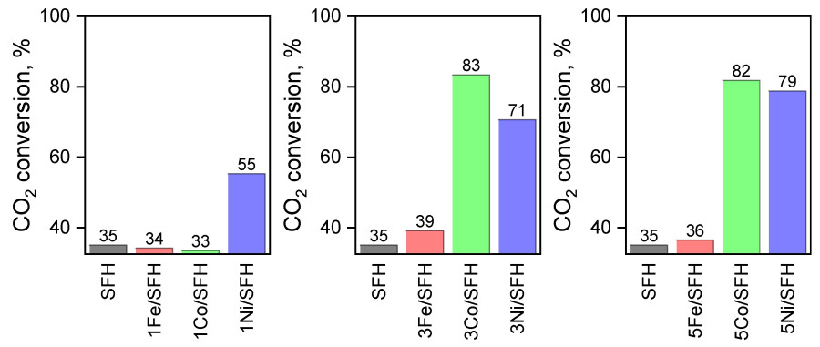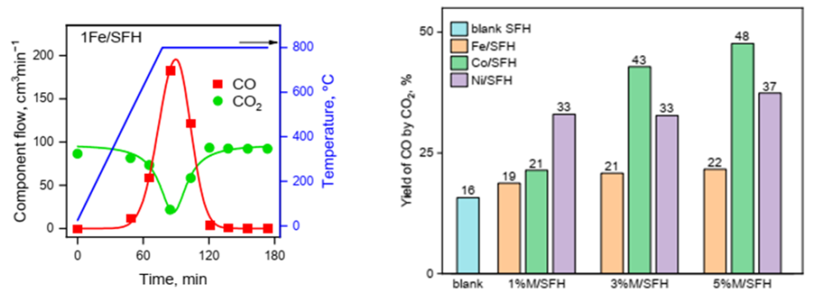 ✓ Проведена газификация лигнинсодержащего сырья (скорлупа макадамии, канариума, багасса сахарного тростника, лузга семян подсолнечника) и последующая конверсия CO2 в CO. Было обнаружено, что при газификации лузги семян подсолнечника и использовании катализатора с добавлением 3 % Cо наблюдается наилучшая каталитическая активность среди исследованных образцов (конверсия CO2 в CO составила 83%). Образцы с добавлением никеля и железа проявили меньшую активность 71 и 39 % соответственно.