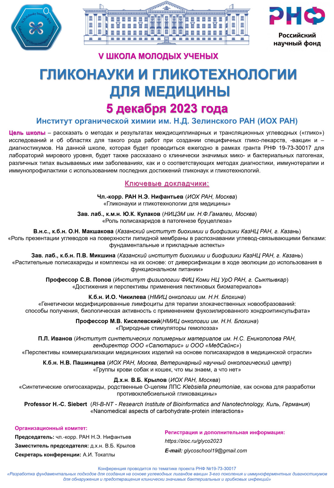 Институт органической химии имени Н. Д. Зелинского приглашает Вас принять участие в школе молодых ученых «ГЛИКОНАУКИ И ГЛИКОТЕХНОЛОГИИ ДЛЯ МЕДИЦИНЫ», которая пройдет 5 декабря 2023 года. По традиции школа проводится в очном (конференц-зал ИОХ РАН, Москва) и онлайн форматах.