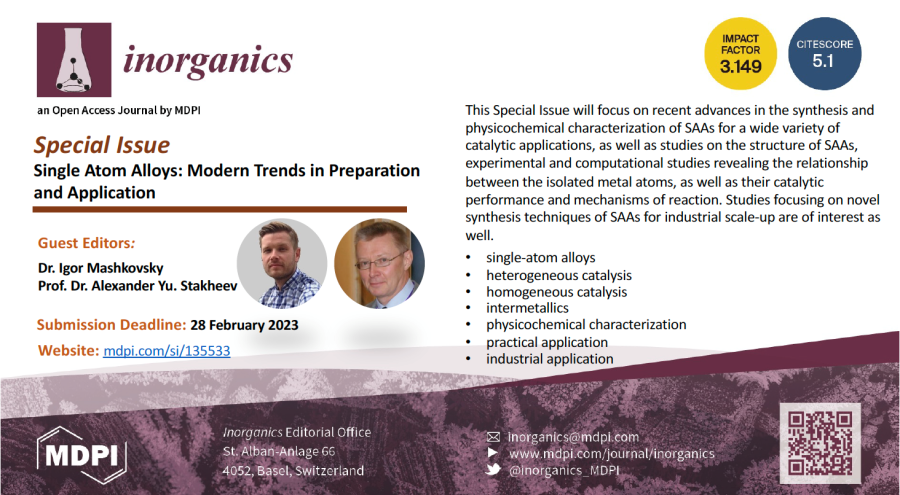 Открыт прием статей в специальный выпуск «Single Atom Alloys: Modern Trends in Preparation and Application» журнала Inorganics (MDPI, IF 3.149, Web of Science Q2).