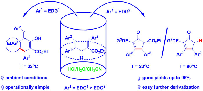 Исследователям лаборатории №3 ИОХ РАН удалось разработать эффективный метод циклизации поляризованных триарилдивинилкетонов по экологически чистому ‘on-water’ протоколу. Обнаруженные превращения протекают в мягких условиях и с высокими выходами. Впервые было показано, что амфифильность субстрата и низкий энергетический барьер реакции являются определяющей предпосылкой для протекания электрофильных и согласованных процессов в водных условиях. Полученные соединения являются аналогами комбретастатина А-4 и могут представлять большой интерес для медицинской химии и онкологии, поскольку такие структуры способны связываться с колхициновым сайтом тубулина и подавлять пролиферацию раковых клеток.